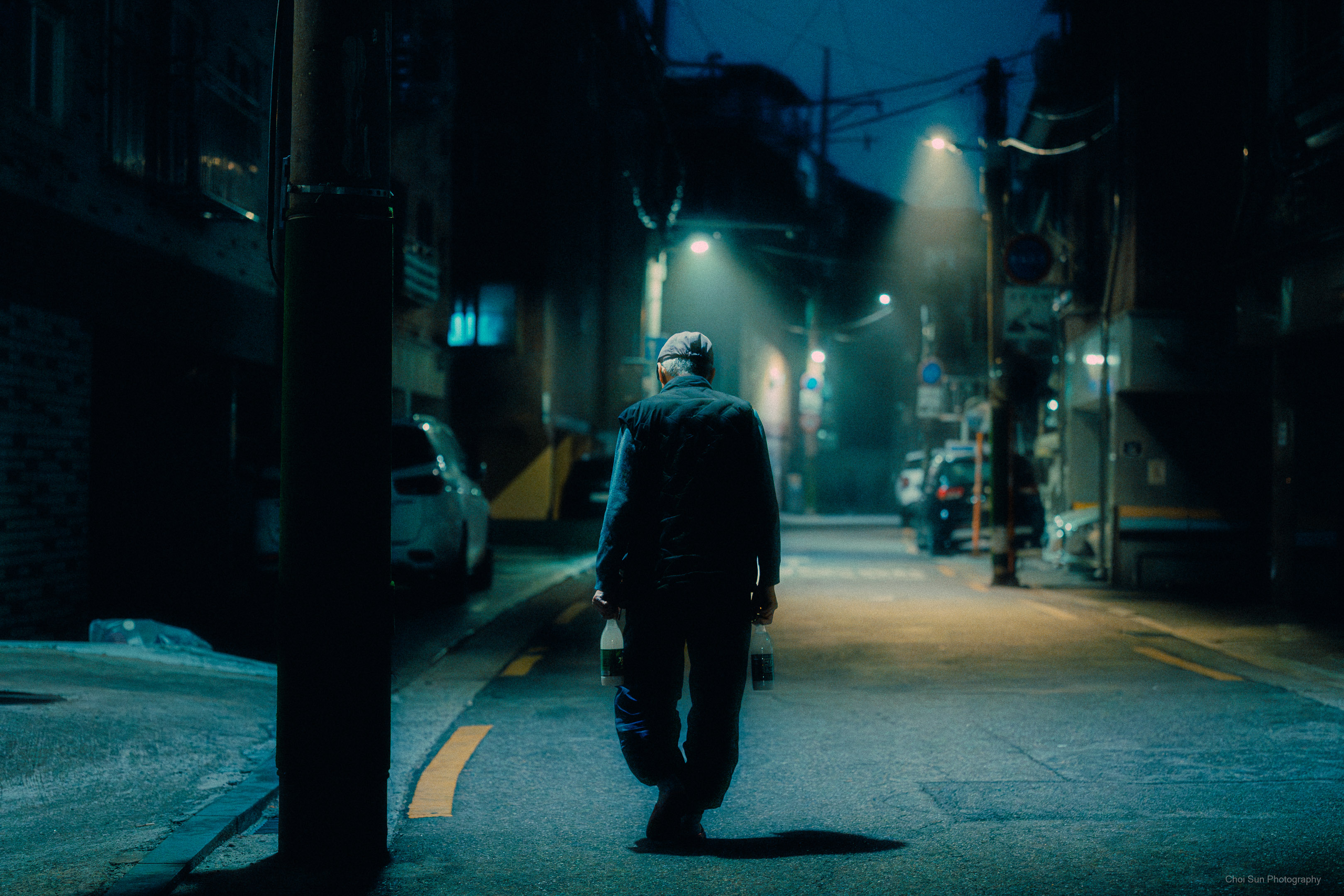 집으로 돌아가는 골목길에서 술병을 양손에 들고 가는 노인의 뒷모습을 촬영.