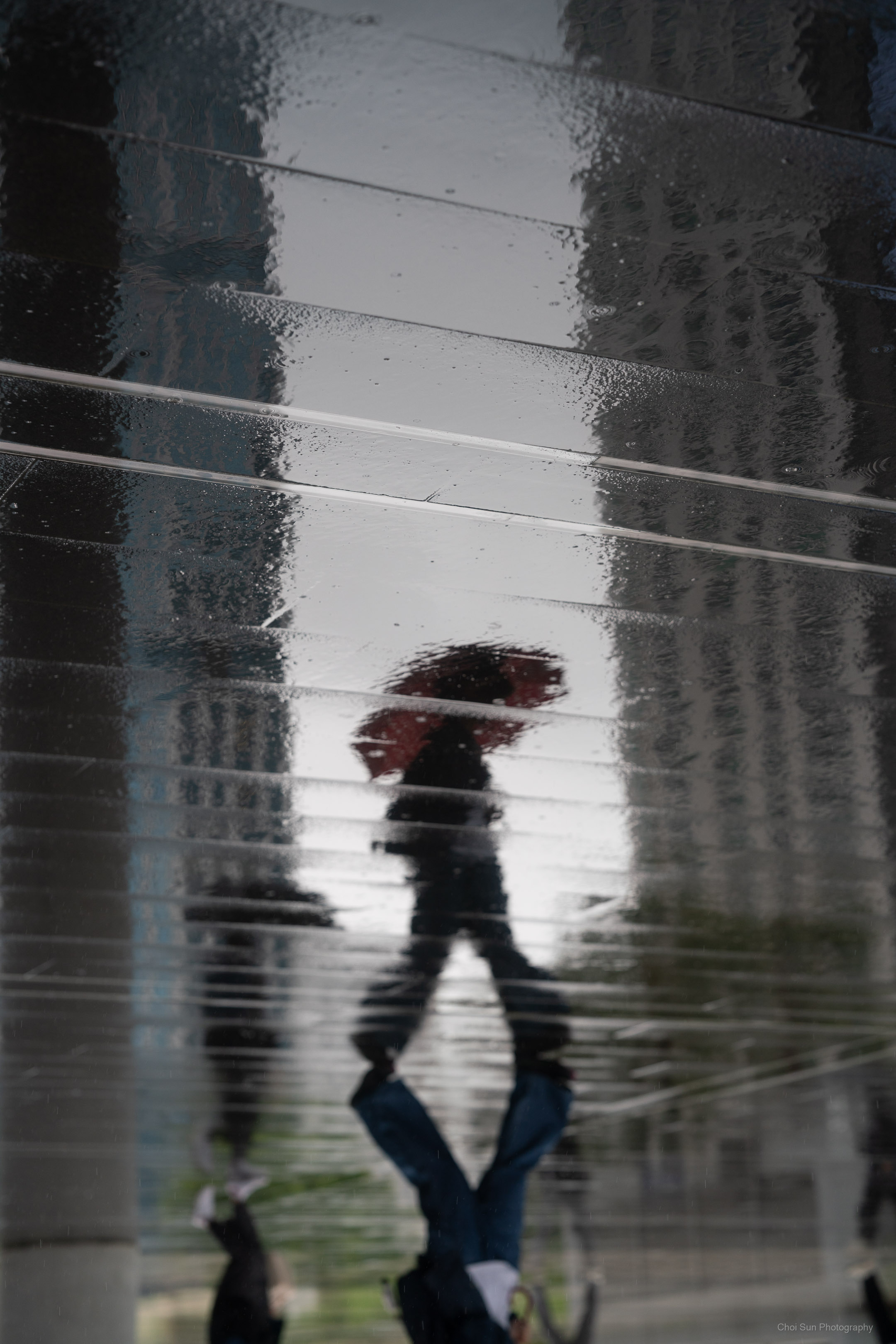 우산이 빨간색, 우측 건물이 약한 노란톤, 흐린 날씨, 좌측 하단의 서브 인물은 색이 거의 없었다.