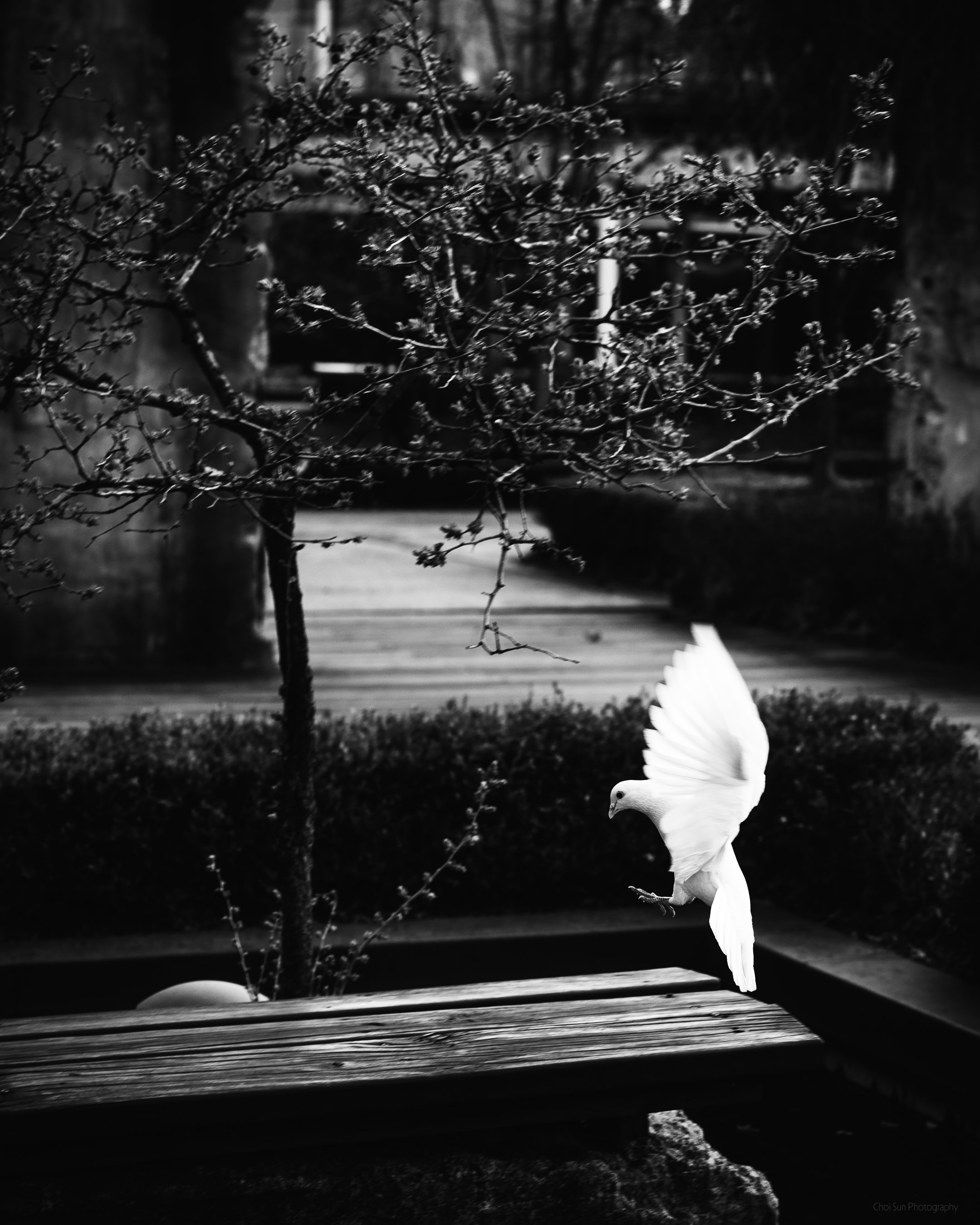 공원에서 새하얀 비둘기가 앉는 장면인데 흑백이 어울릴 것 같아서 찍은 사진.
