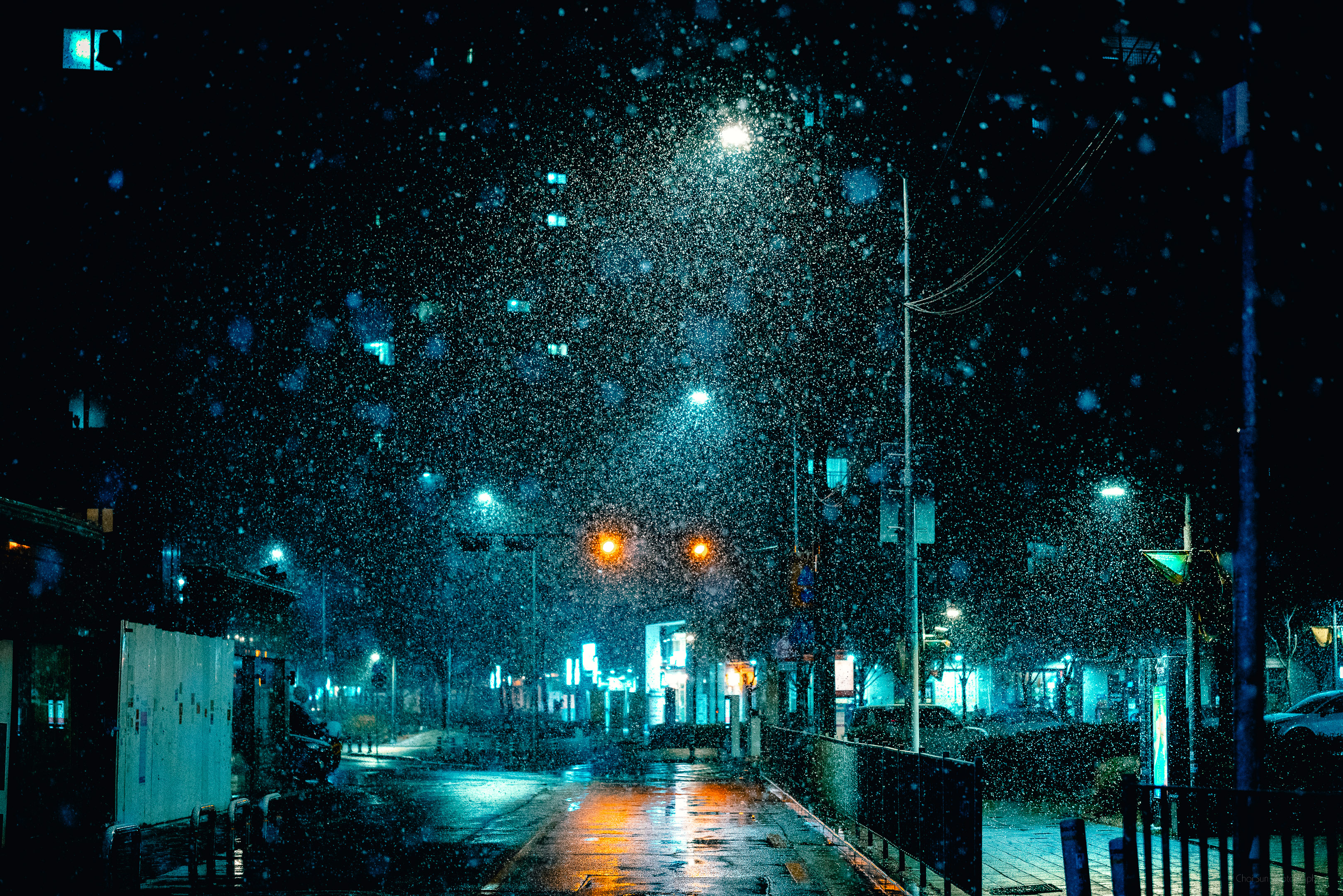 사이클링 사진은 보통 이런 라인과 스포트 라이트가 중첩되는 구도에 사이클리스트를 배치하는 것을 좋아하는데 이런 빈 거리로도 감성적이게 만드는 밤에 내리는 눈의 마법이다.
